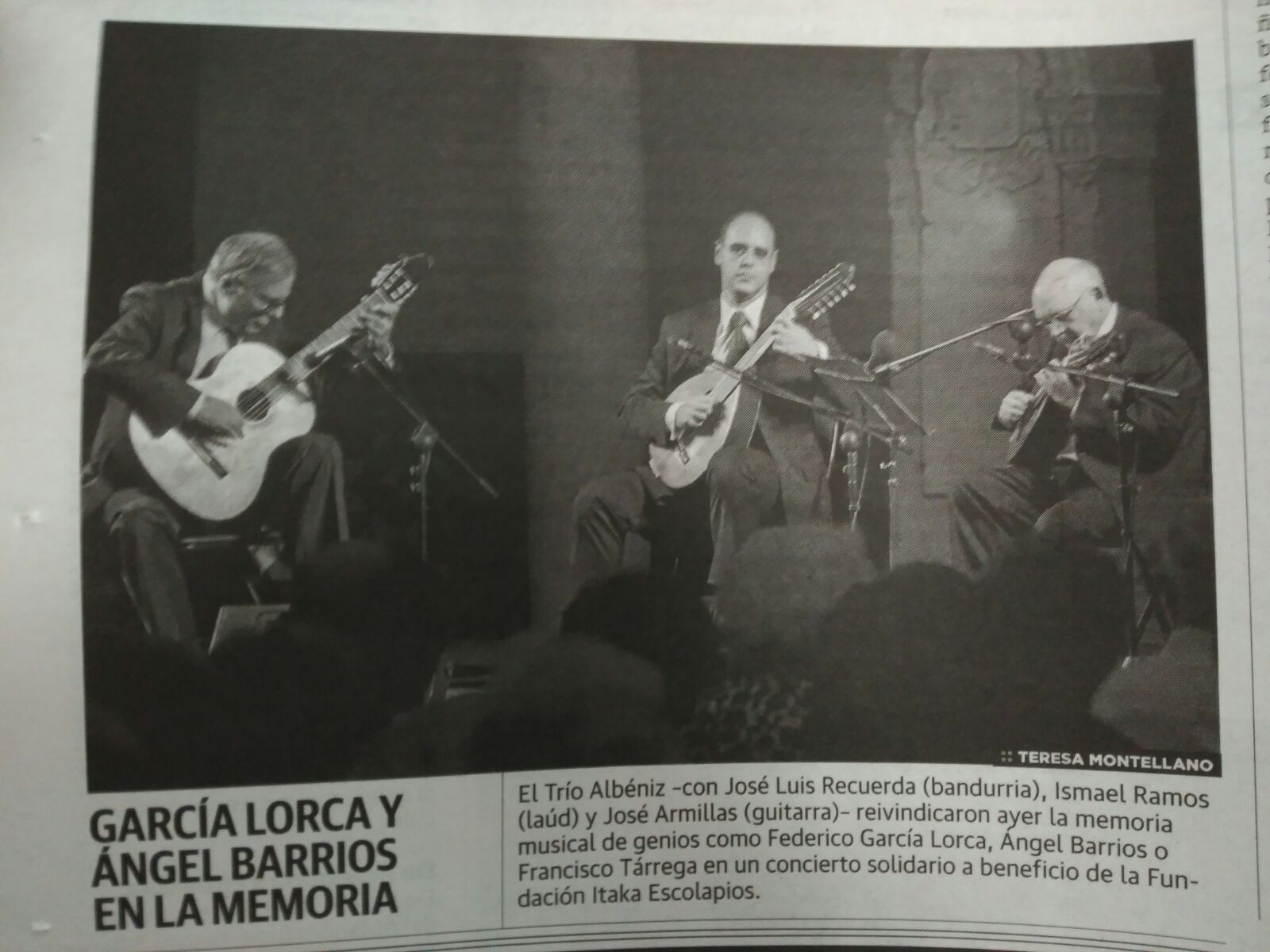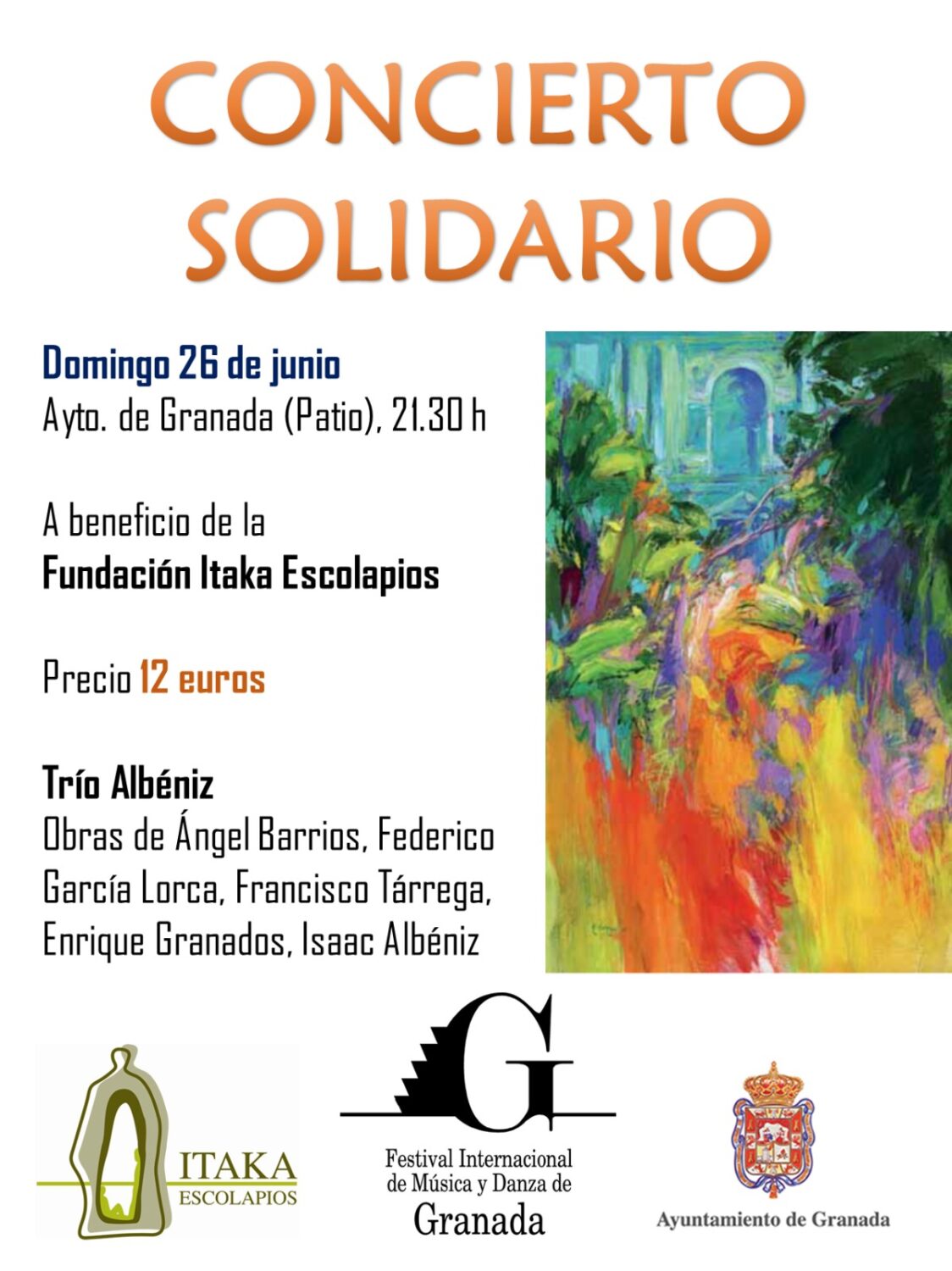 El Festival Internacional de Música y Danza de Granada (FEX), en colaboración con el Ayuntamiento de Granada, convoca seis conciertos solidarios. Este año la Fundación Itaka – Escolapios ha sido seleccionada para llevar a cabo uno de los conciertos solidarios. El reconocido Trío Albéniz de Granada ha colaborado con Itaka-Escolapios para organizar este concierto, con José Luis Recuerda, Ismael Ramos y José Armillas, que ha tenido lugar en el patio del Ayuntamiento de Granada el 26 de junio. La cantidad recaudada en la venta de entradas y aportaciones para fila 0 ha sido de 2.474€ a beneficio de Itaka – Escolapios. Muchas gracias a todos los participantes, así como al Trío Albéniz de forma especial por esta colaboración, al FEX y al Ayuntamiento de Granada.