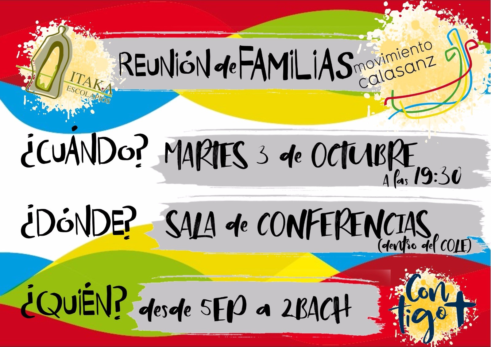 Llevamos ya un mes de actividades del Movimiento Calasanz en Granada. Durante todos estos días y semanas el Movimiento Calasanz en Granada ha estado programando, convocando y arrancando las actividades de todas las etapas: Paso a Paso, Aventureros, Artesanos, Caminantes, Bachillerato, Catecumenado y Discernimiento. En las imágenes podéis ver la vida de este inicio de curso, de cada uno de los pequeños grupos que avanzan y crecen en nuestros locales, de las familias de Paso a Paso que también se reúnen en grupo, de los diversos equipos de responsables que animan y alientan este proyecto, de los chavales de 2ºBachillerato que han tenido el Cursillo de Iniciación de Monitores, de la celebración del PASO 2017 de los Grupos, de las convocatorias en los coles, del inicio del Movimiento Calasanz en el cole de Cartuja, de las comunidades de la fraternidad Albisara en la asamblea de inicio de curso… Con cada una de las personas que salen en las imágenes somos más, contigo somos más. Feliz curso 2017-2018.