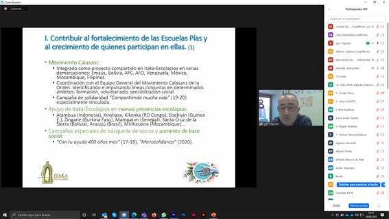 - La contribución al fortalecimiento de las Escuelas Pías y al crecimiento de quienes participan en ellas, destacando el trabajo de impulso del Movimiento Calasanz en los países donde está presente Itaka-Escolapios, la instauración y consolidación del Día del Voluntariado, así como el comienzo de la presencia de Itaka-Escolapios en nuevos lugares de fundación de la Orden.