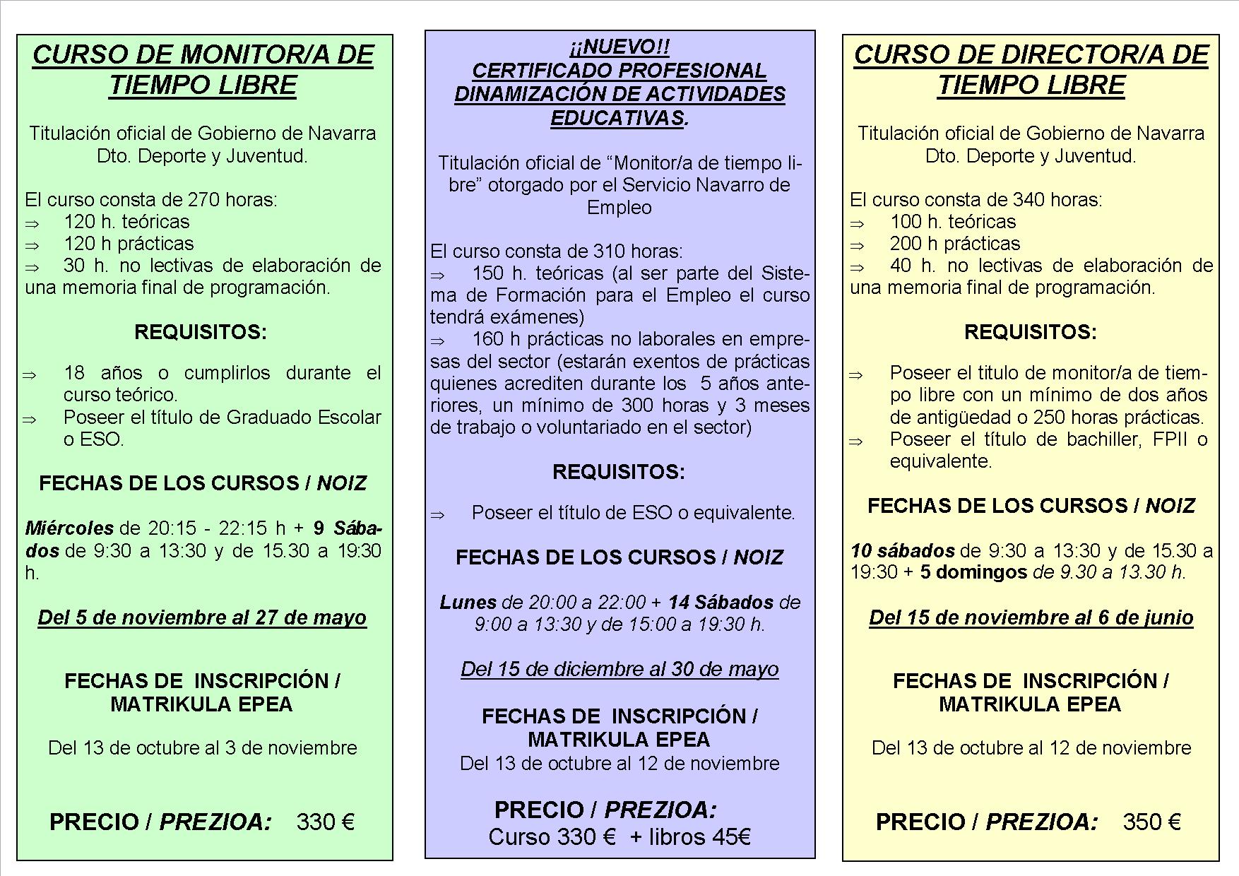 La escuela Lurberri, de Itaka Escolapios, abre los plazos de inscripción para los cursos de educación en el tiempo libre. En el documento adjunto se puede ver la oferta para este curso 2014-2015. Si estás interesado/a,puedes pasarte por nuestras oficinas de lunes a viernes, de 10 a 13 h. o llamarnos al 948 203 891 y te informaremos de todo.Tríptico  inscripcion 2014-15pTríptico  inscripcion 2014-15